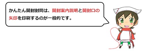 かんたん開封封筒は、開封方法をよりわかりやすくする為に、開封案内説明と開封口の矢印を印刷するのが一般的です。社名・住所等を印刷するタイミングで一緒に印刷いたします。